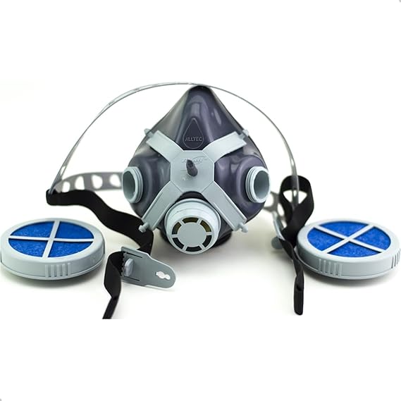 Máscara: O corpo do respirador é moldado em elastômero sintético atóxico, ultra macio, com bordas internas almofadadas, proporcionando uma perfeita vedação aos diferentes tipos de rosto de usuários. Possui uma válvula de inalação e duas de exalação. A aranha frontal de fixação, o conector para filtro, as válvulas e os cartuchos são fabricados em plástico resistente ao calor. Proporciona fixação à face em quatro pontos, através de tirantes elásticos móveis com regulagem de pressão proporcionada pela fácil variação de comprimento, através de passadores em plástico resistente.