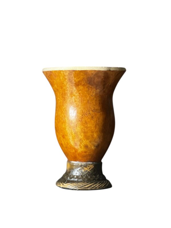 Esta cuia é a representação da tradição do chimarrão. O corpo é feito de porongo natural, um material que, quando curado corretamente, preserva o sabor da erva e absorve o calor, oferecendo uma experiência única. A base é uma peça de massa (resina sintética), trabalhada com detalhes decorativos, que garante estabilidade e protege o porongo, tornando-a ideal para o manuseio diário.